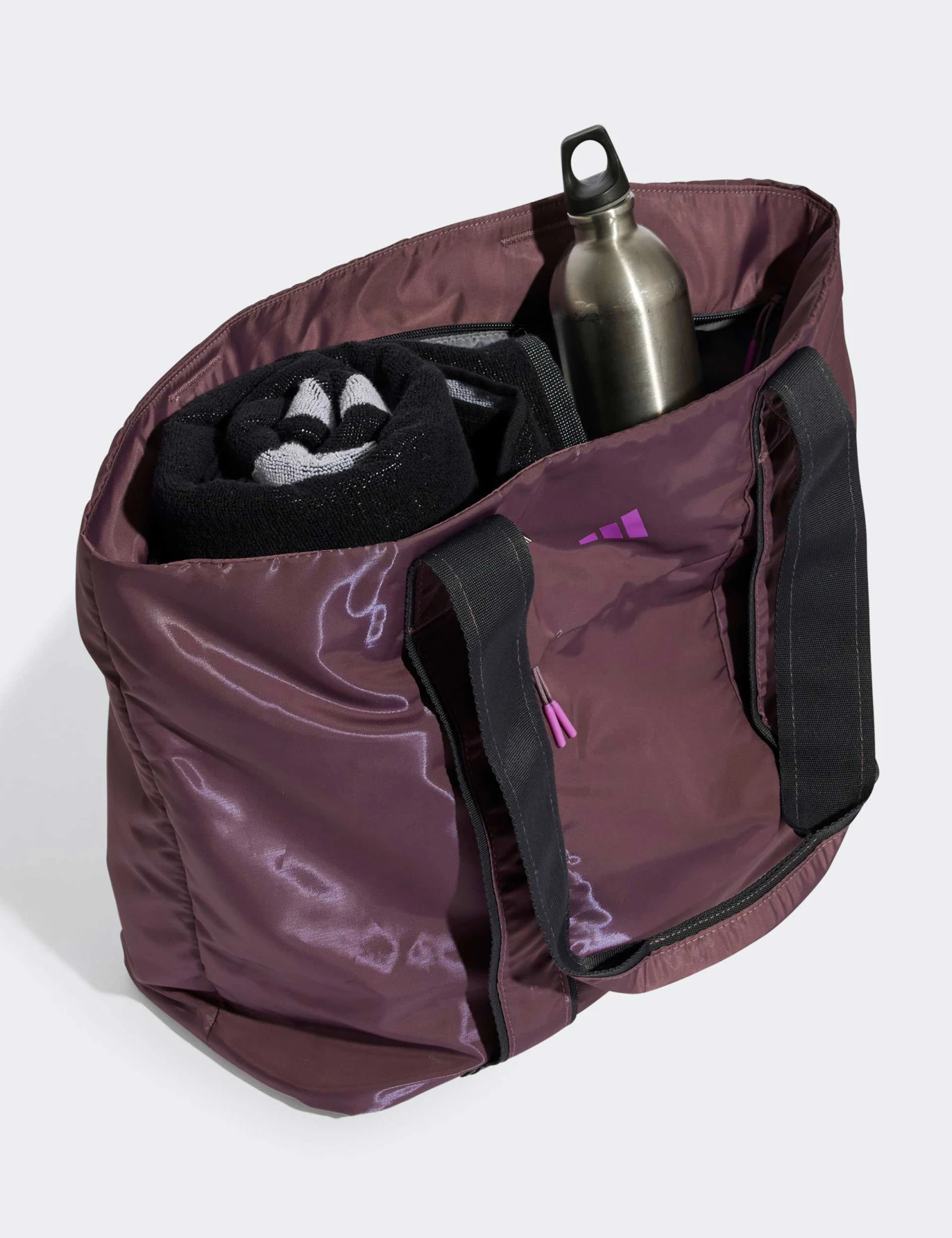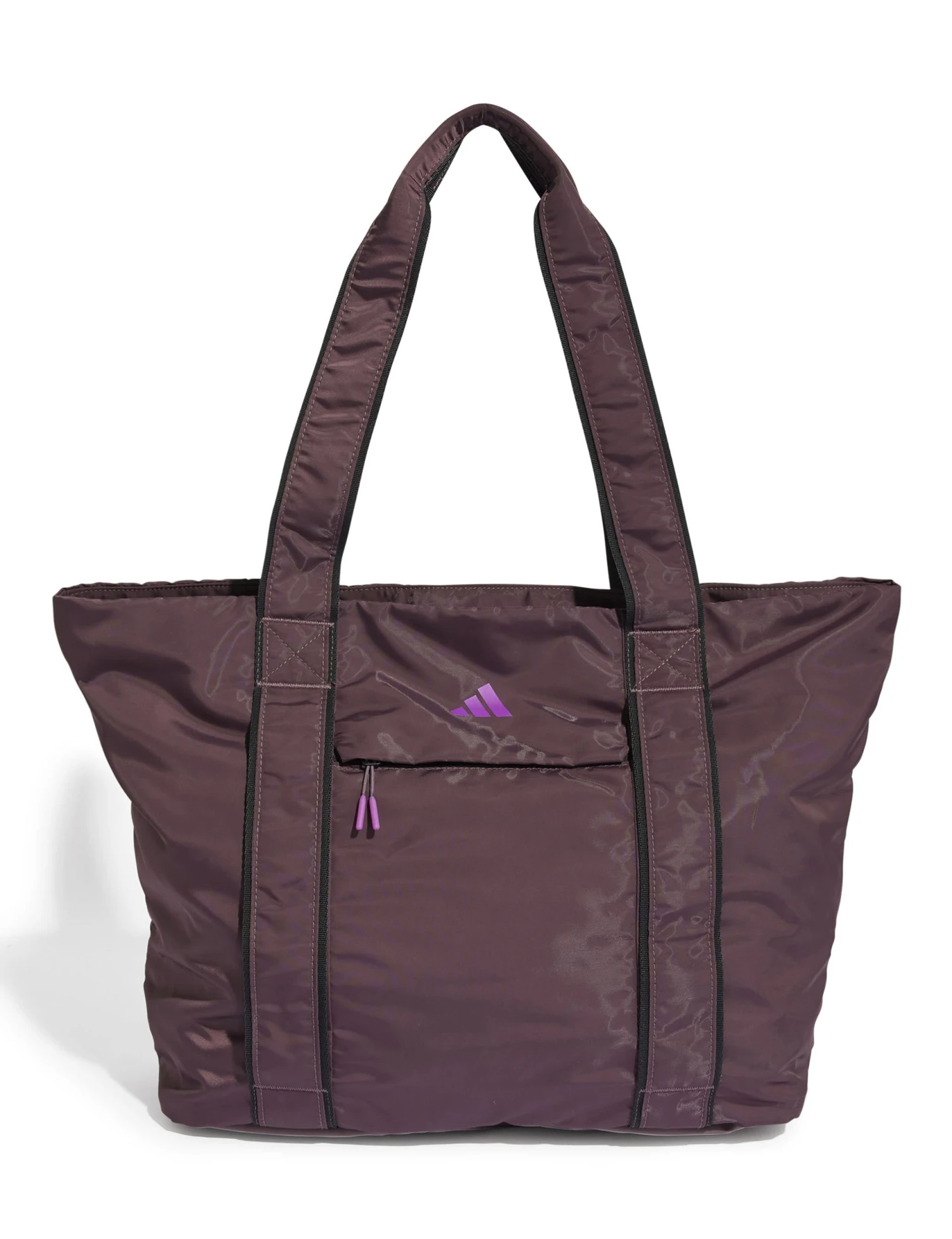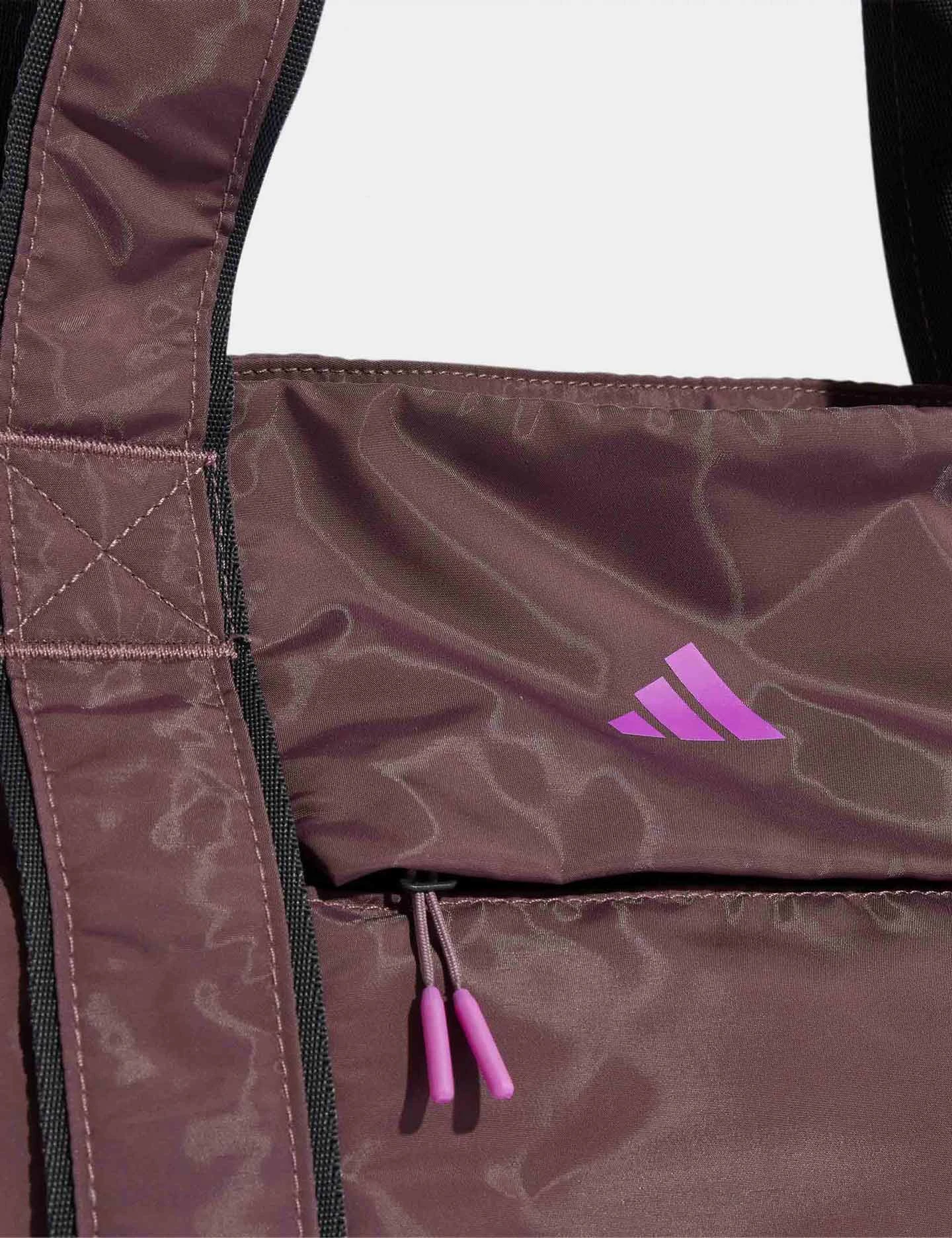 After a killer yoga flow, stash your essentials in this durable yet lightweight adidas yoga tote bag. With padded straps and a roomy interior to hold your towel, water bottle and more, this bag is your perfect workout companion. The front zip pocket keeps small items secure, and the padded divider protects your electronics from the rest of your gear. Webbing on the front secures your mat.